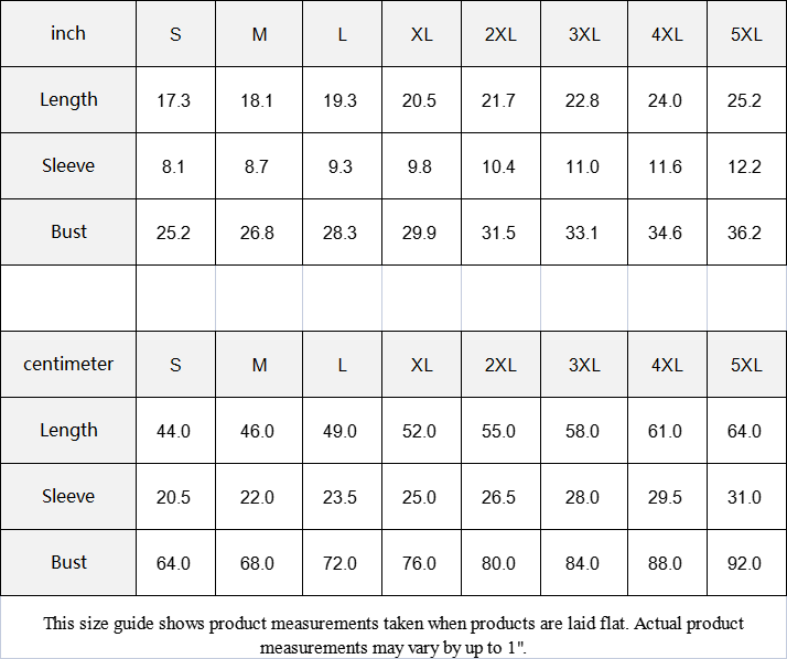 | inch | S | M | L | XL | 2XL | 3XL | 4XL | 5XL |